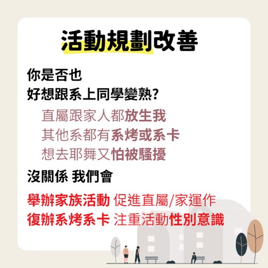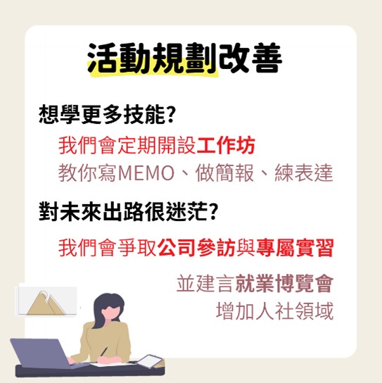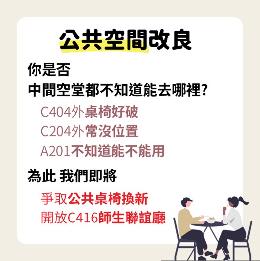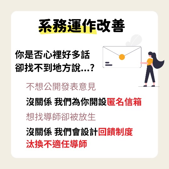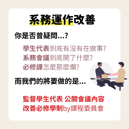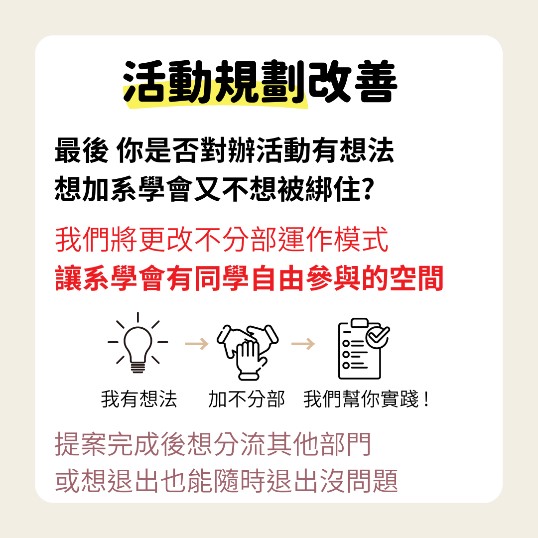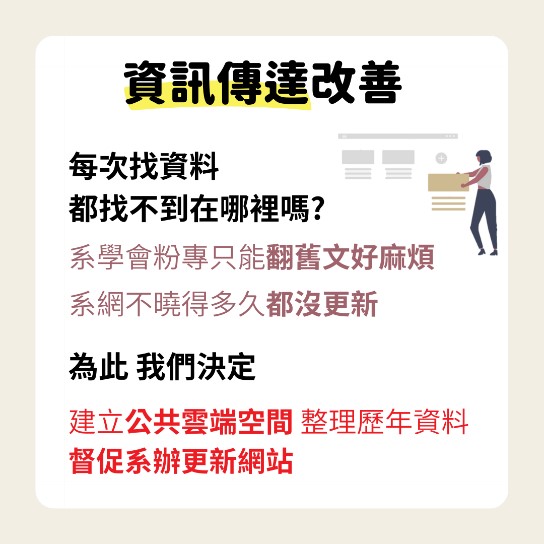 資訊視覺設計 參選系學會長政見懶人包 2022-05-14 / 這是我之前參選系學會會長,為了方便同學了解我的政見內容所做的懶人包。 設計理念主要如下: 配色以大地色系為主,配合人社院建築色調。 並將內容分為:系務運作、資訊傳達、公共空間、活動舉辦 每一頁版面配置為 黑色-拋出疑問 褐色-當今現況 紅色-實際改變 並加上與內容相關之icon協助理解