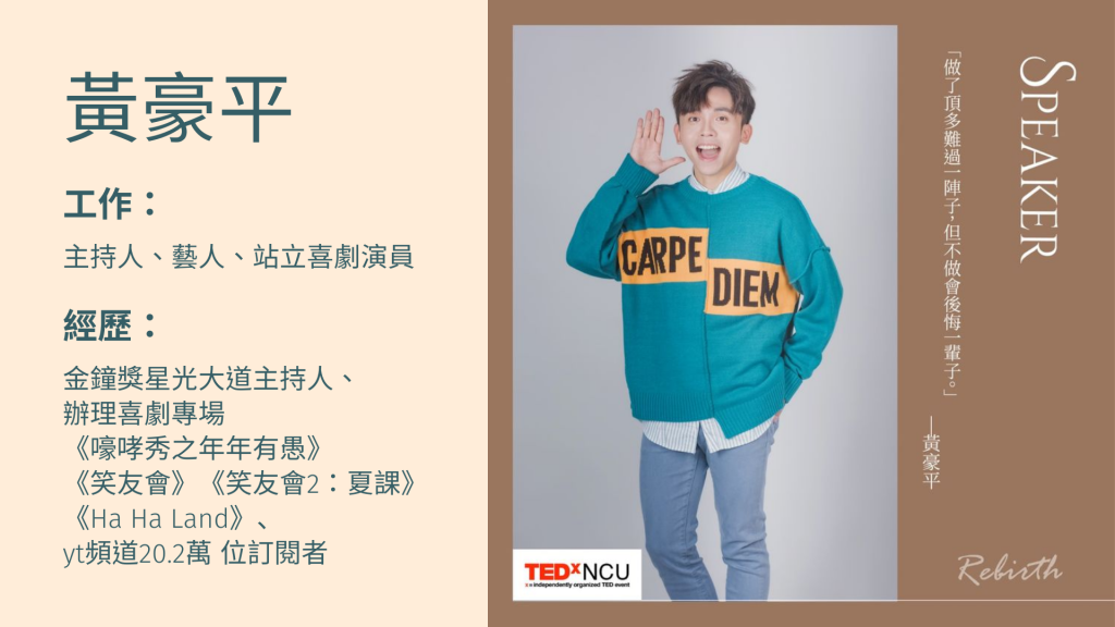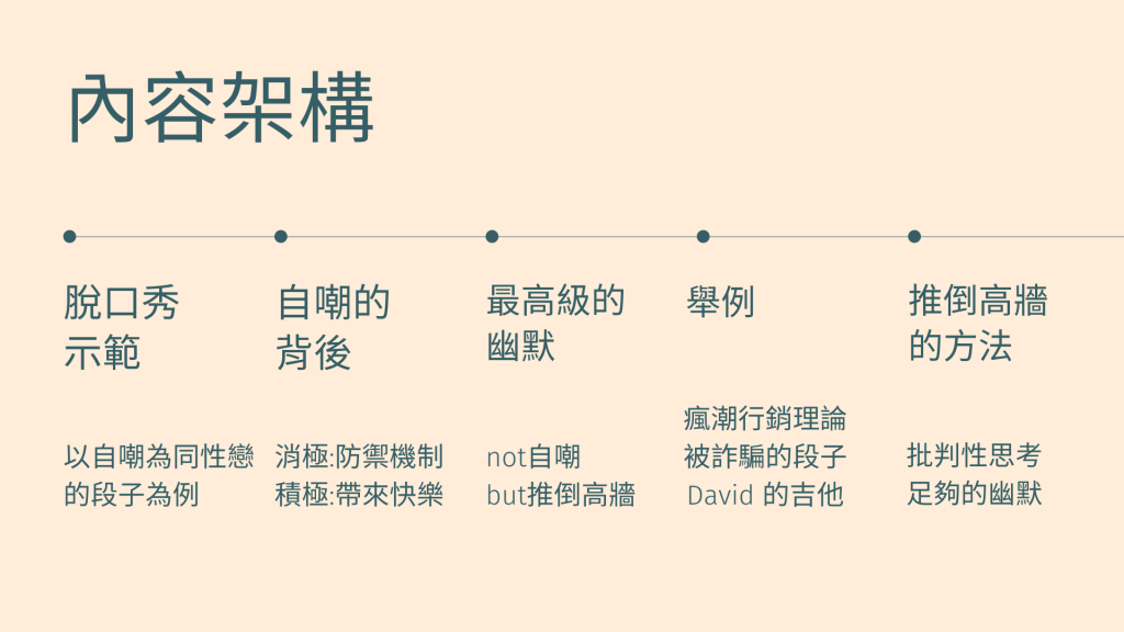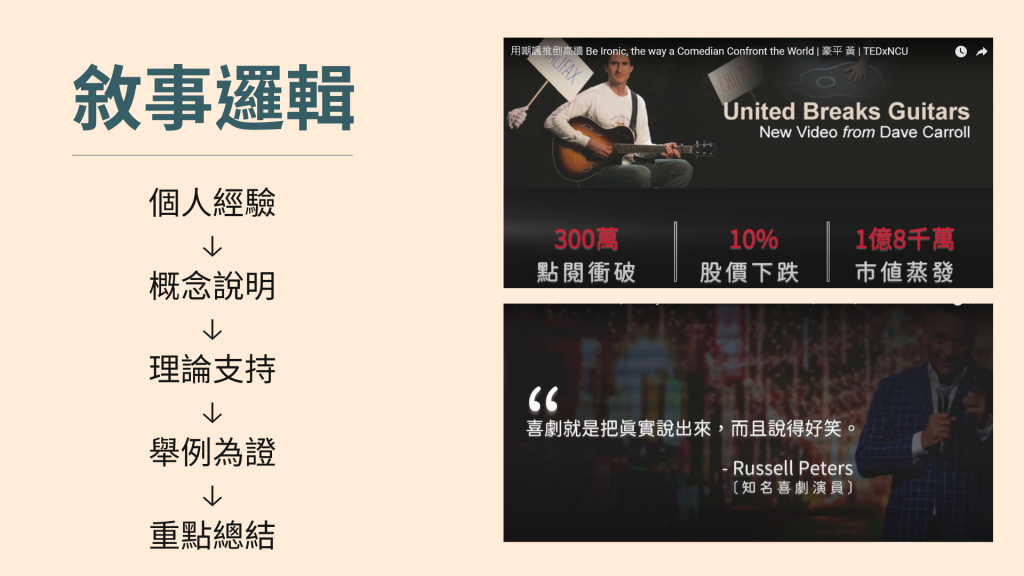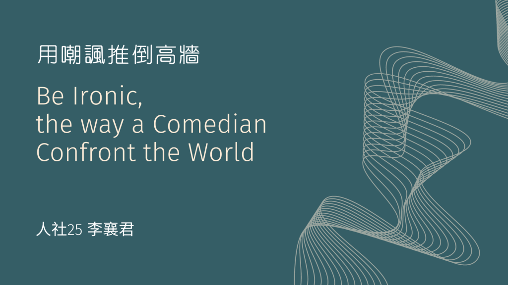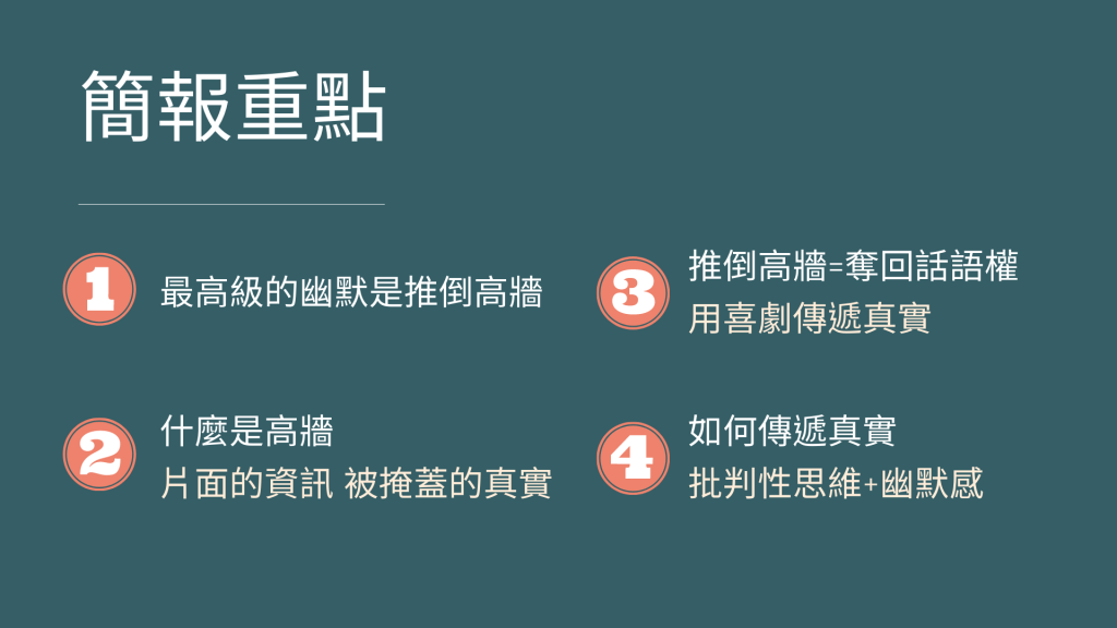 資訊視覺設計 用嘲諷推倒高牆 2022-05-14 / 這是某次視覺工作坊的作業 要將一個TED影片內容做成資訊架構分析簡報 這一張是封面,說明本次報告主題。 這一張主要是簡介這次要報告的TED的講者-黃豪平的個人經歷。 這一張則是先說明本場TED的內容架構為何,以及每個大標下面又有什麼細項。 接下來是說明本場TED的核心概念與重點 因為內容較多就分成了兩頁來說明。 再來是分析講者對於簡報設計的資訊傳達手法為何。 並以實際內容來佐證上一頁分析的結果 說明完圖像設計,最後是分析講者敘事的脈絡