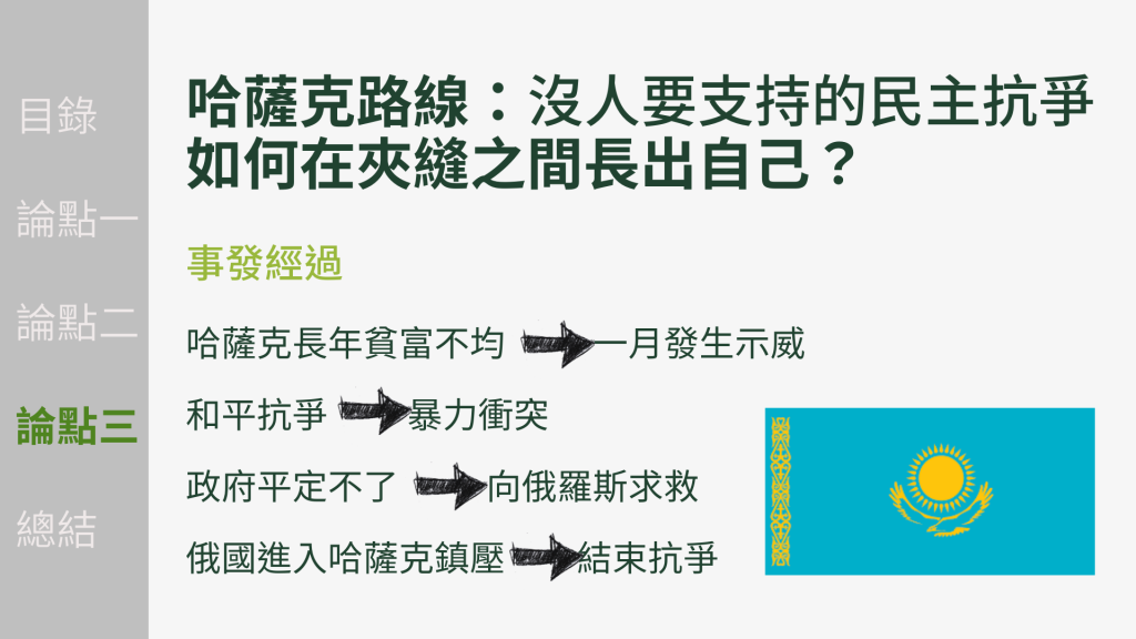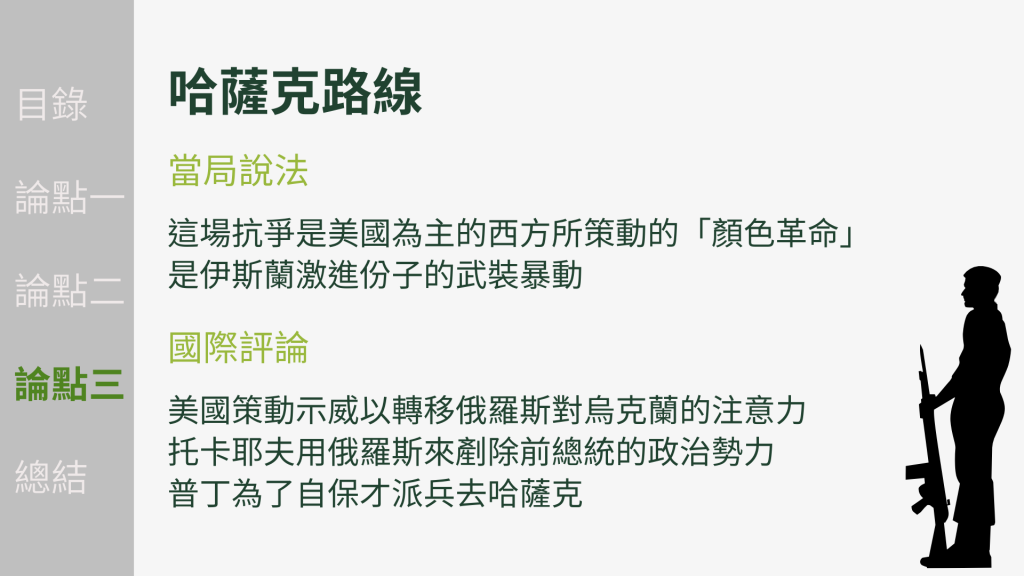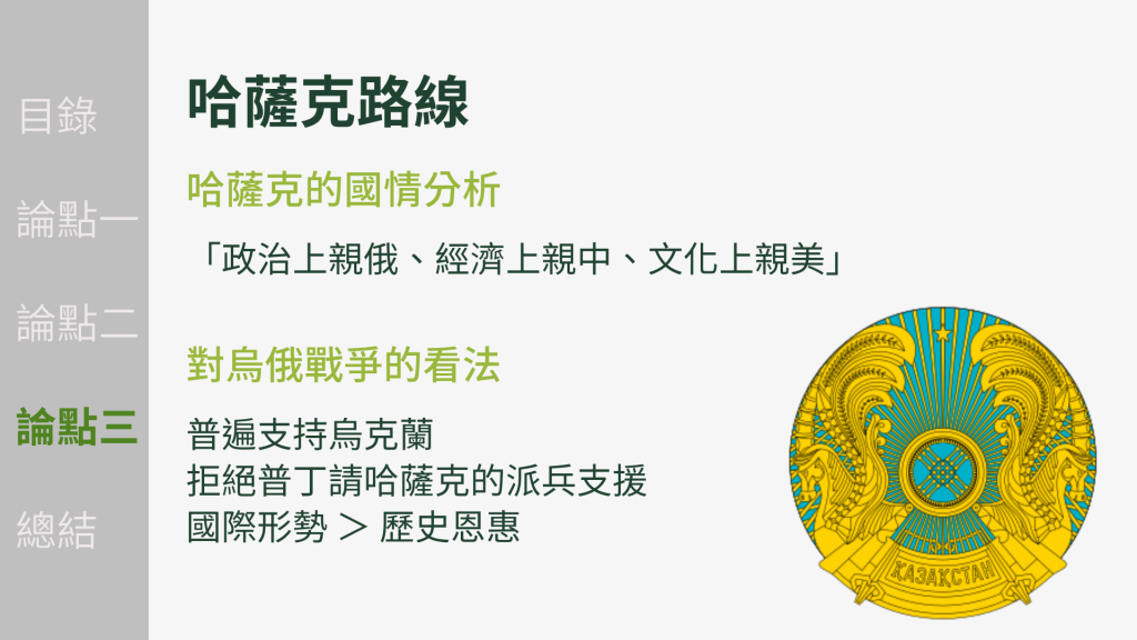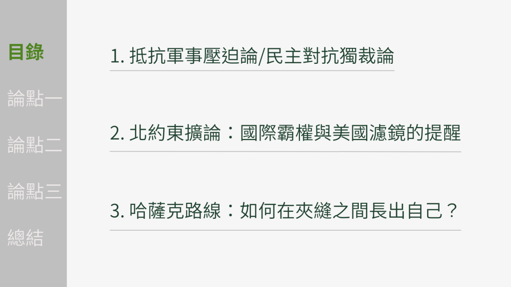 並分為:軍事壓迫論、北約東擴論、哈薩克路線 三大論點