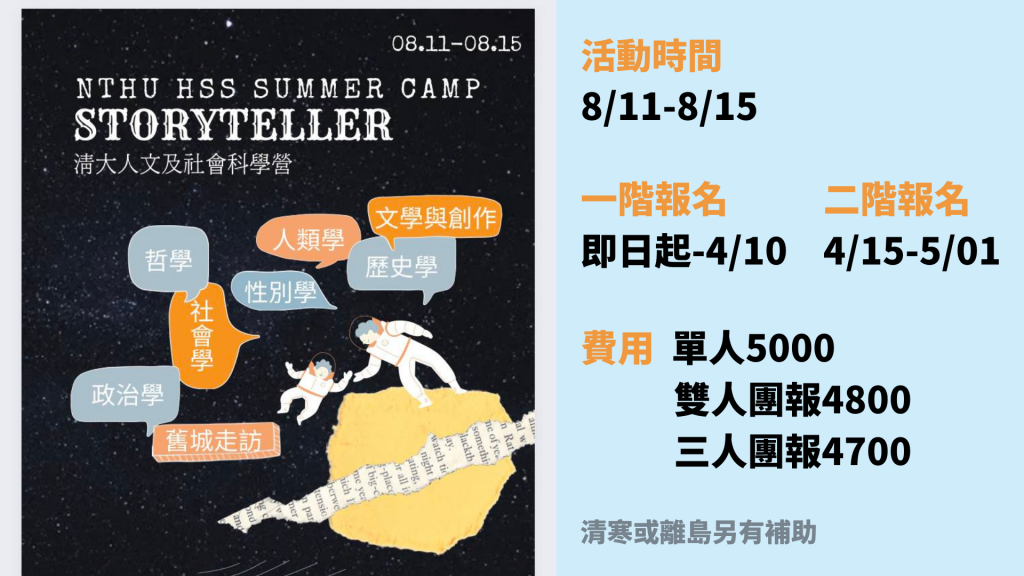 資訊視覺設計 返校宣傳簡報 2022-05-14 / 這是之前為了返校宣傳人社營所做的簡報 內容包含: 清大人社系所介紹-課程規劃、九大領域、必修內容 主要學程介紹-人類學、社會學、哲學、文學與創作 未來出路 人社營宣傳 色調是以藍、白、橘三色為主互相搭配 字型則以黑體為主,運用粗度變化分別標題與內文